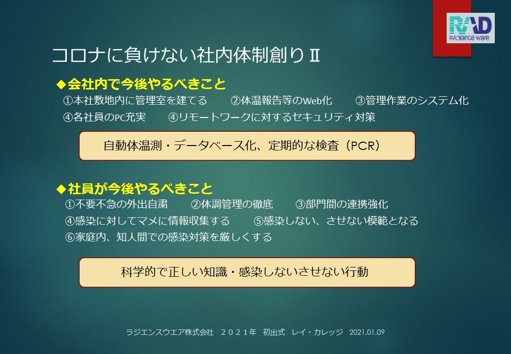 今年は「コロナ危機を乗り越える」について中嶋社長よりレイカレッジを受けました。