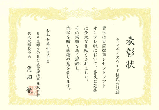日本医師会ORCA管理機構様より当社は「オンプレミス版導入においてトップの件数」により表彰されました。